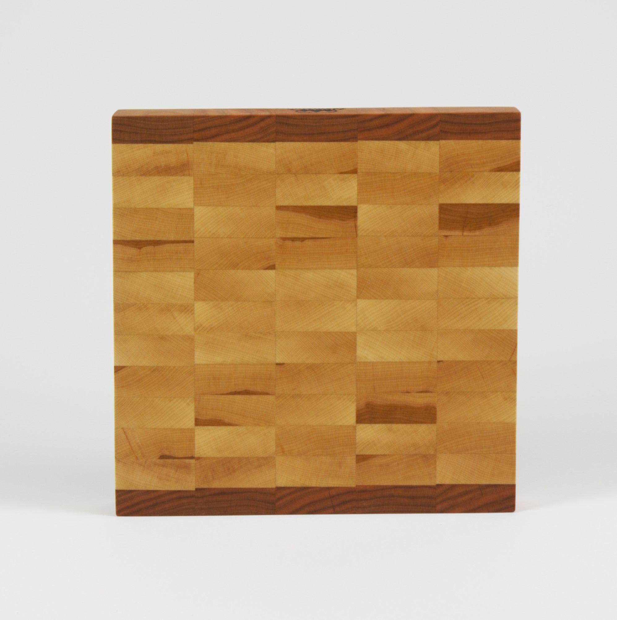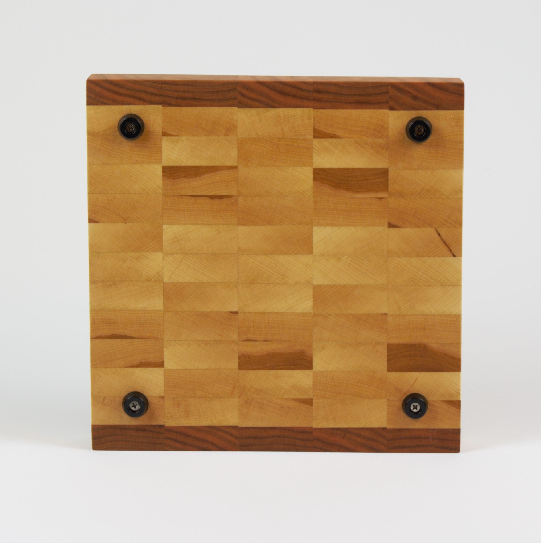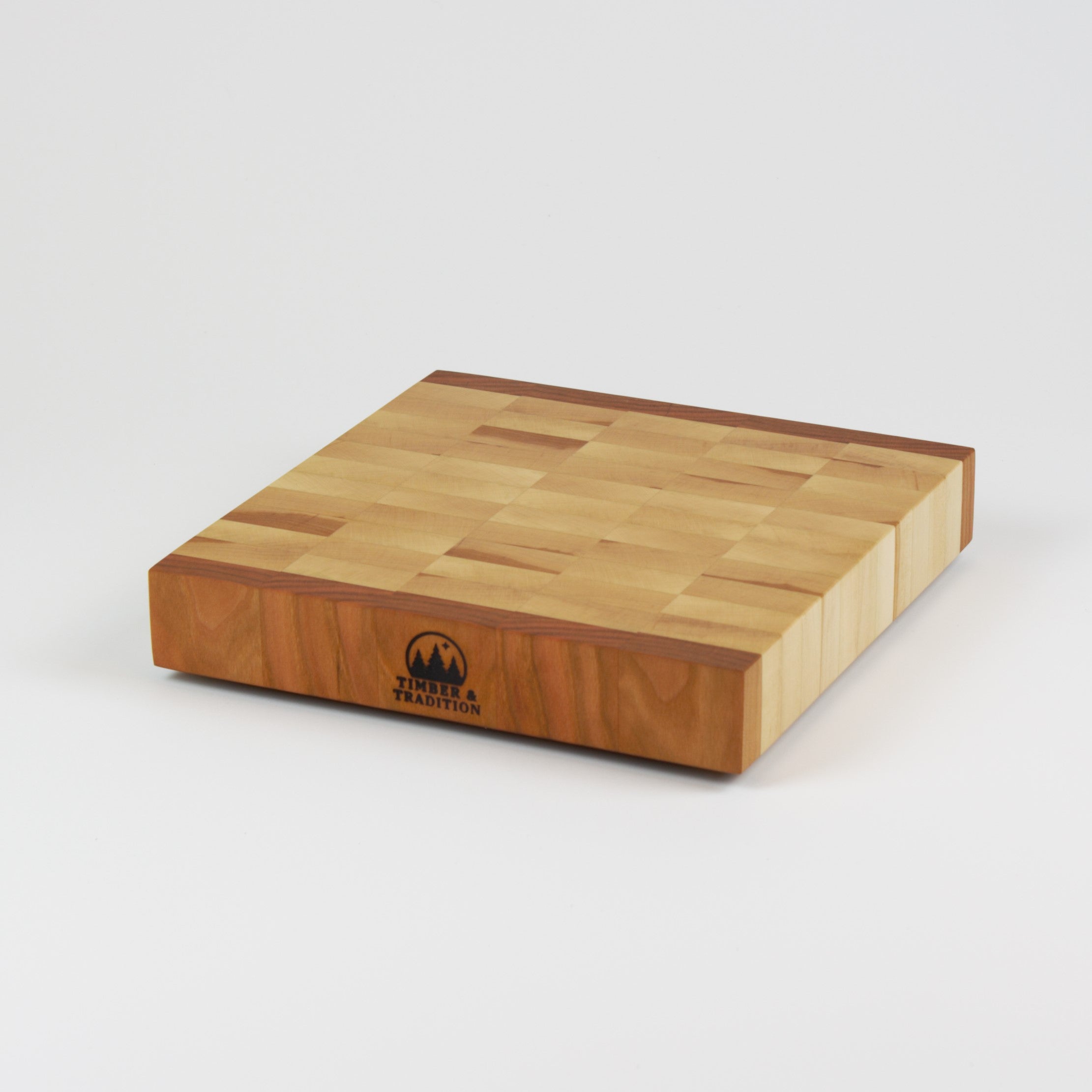 Indulge in the classic charm of this end-grain cutting board crafted from durable hard maple and adorned with rich cherry wood accents. Stainless steel hardware attaches rubber non-slip feet, making slicing and dicing on this 10 x 10 x 1.75 inch board a breeze.