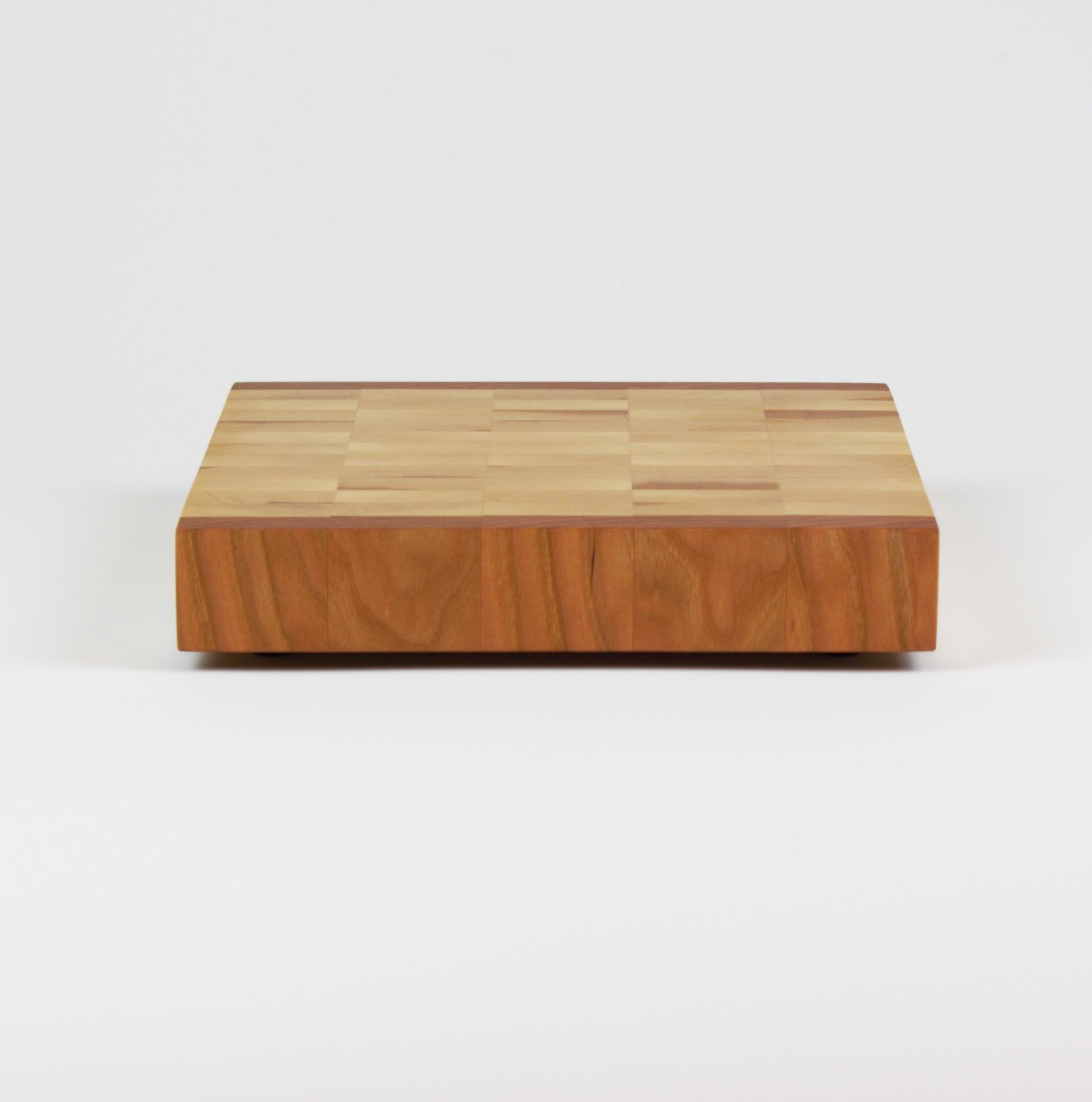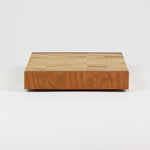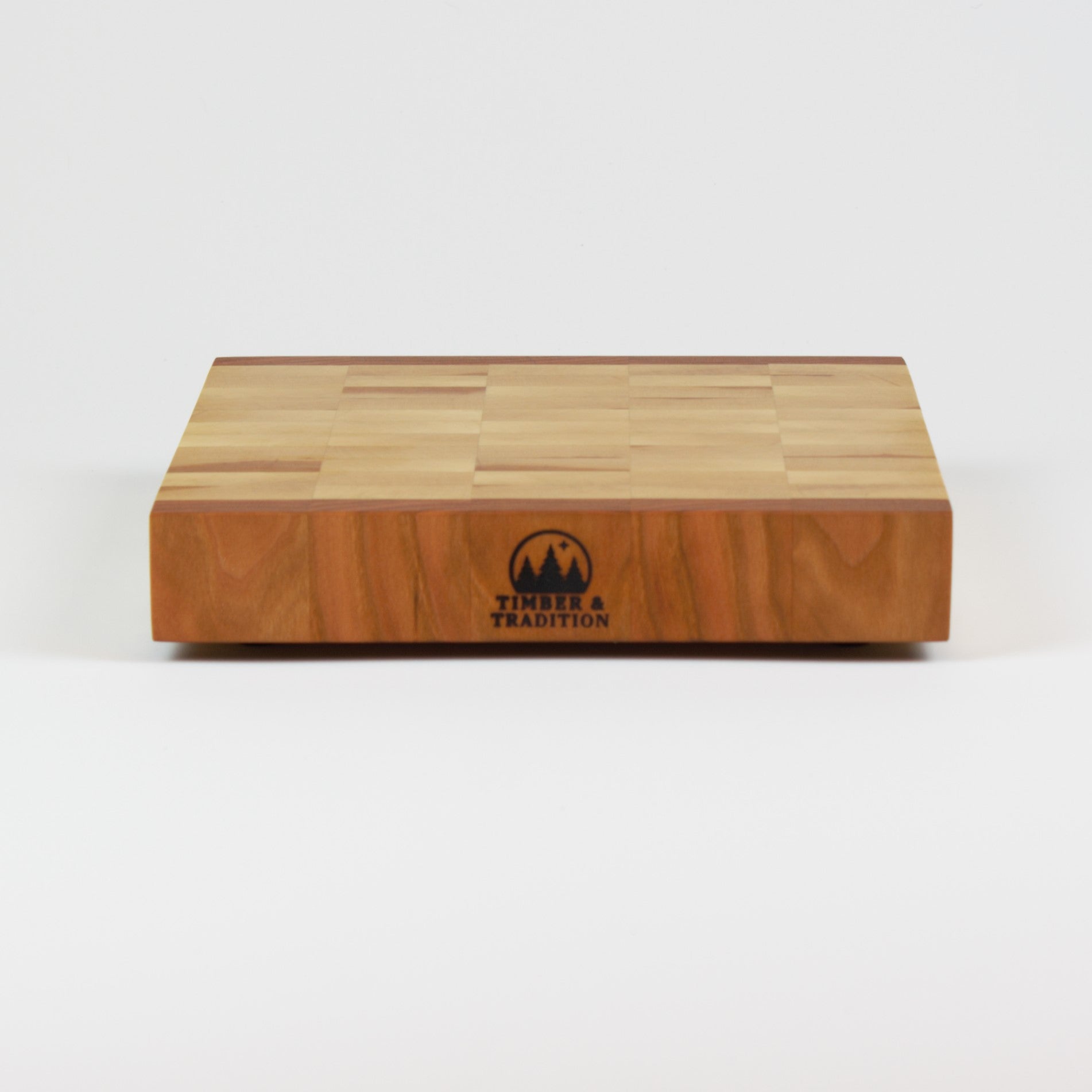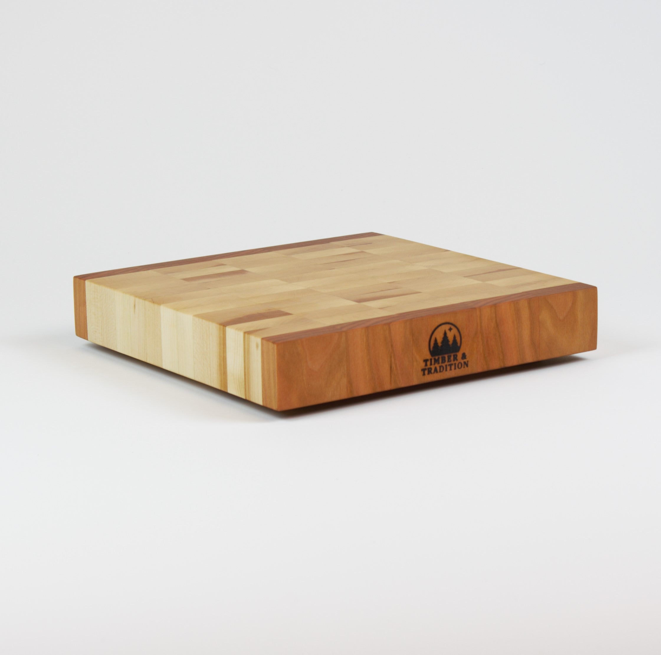 Indulge in the classic charm of this end-grain cutting board crafted from durable hard maple and adorned with rich cherry wood accents. Stainless steel hardware attaches rubber non-slip feet, making slicing and dicing on this 10 x 10 x 1.75 inch board a breeze.